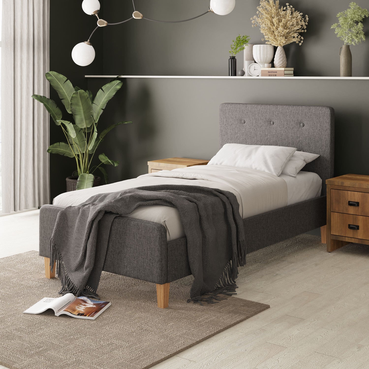 Upgrade your bundle with a stylish platform bed in dark grey fabric and black wooden legs that fits any room and decor. Includes our hybrid mattress and best-selling bedding products.